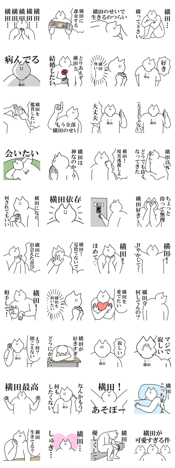 横田さんに送る名前スタンプ。愛情強め。好きな人彼氏彼女推しに使える!メンヘラ、ヲタク、ヤンデレ、ネタ系、アイドル好きな方へ。ヨコタ よこた/oroninet