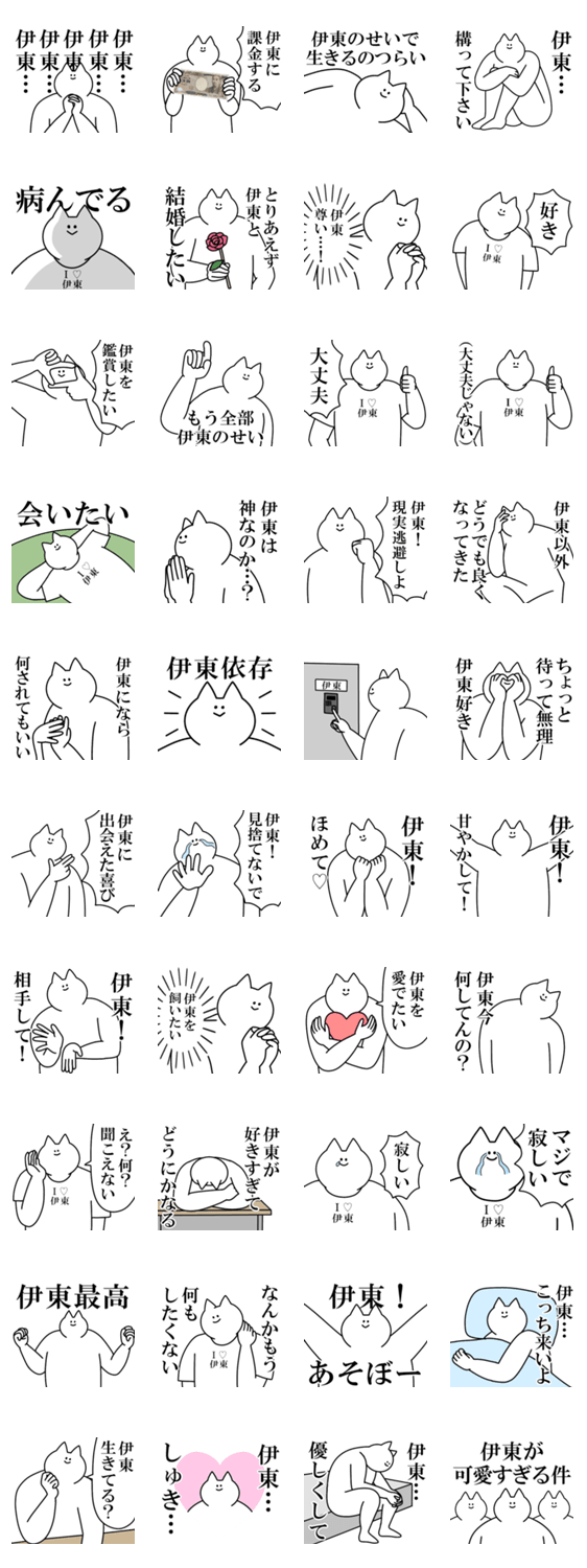 伊東さんに送る名前スタンプ。愛情強め。好きな人彼氏彼女推しに使える!メンヘラ、ヲタク、ヤンデレ、ネタ系、アイドル好きな方へ。イトウ いとう/oroninet