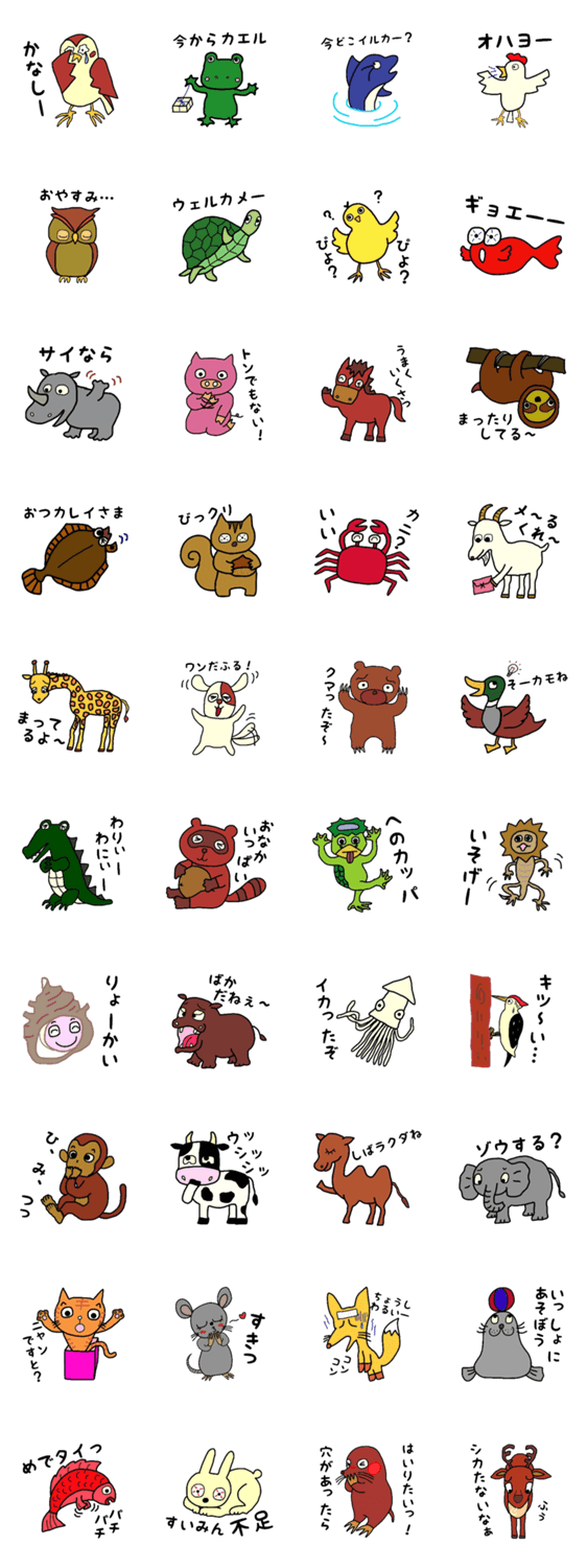 日常使う言葉をダジャレ等をいれて面白くつくりました。スタンプの絵のほとんどを色々な生き物で描きました