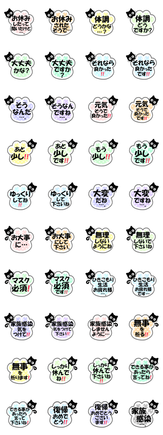 友達や友達の子、大事な人、先輩や上司が学校や仕事をお休みした時に使える可愛い肉球のお見舞いスタンプです。