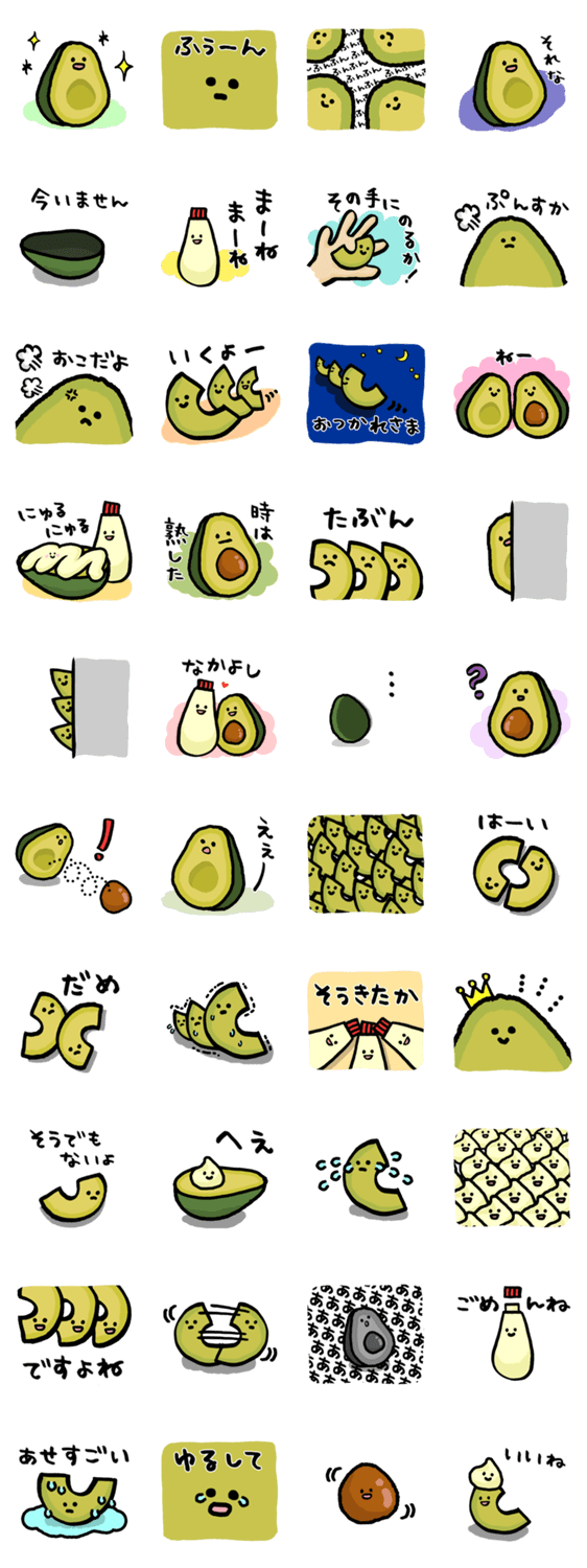 あぼかどさんと、ゆかいな仲間たちのスタンプです。ゆる~くちょうどいい感じのあいづちを返してくれます。アボカドとマヨネーズの組み合わせが大好きです☆