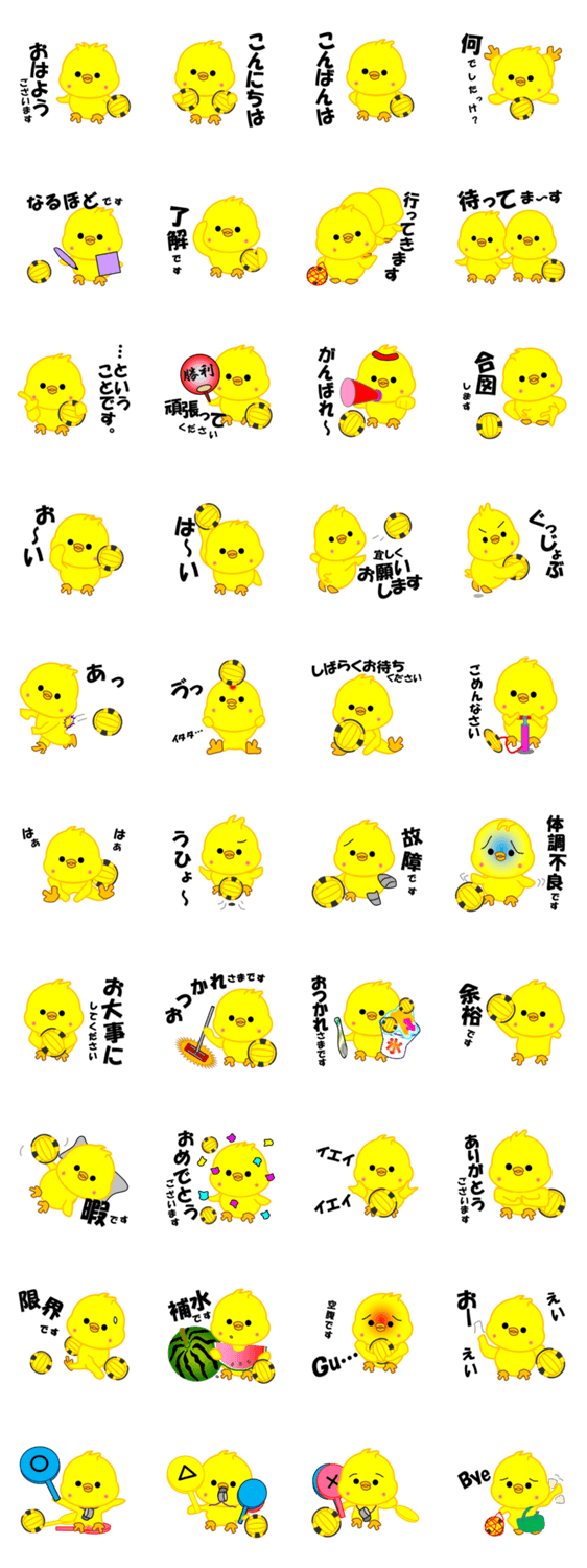 ドッジボールをするひよこ(ヒヨコ)で会話するスタンプです。練習や試合、日常会話に使えるスタンプです。