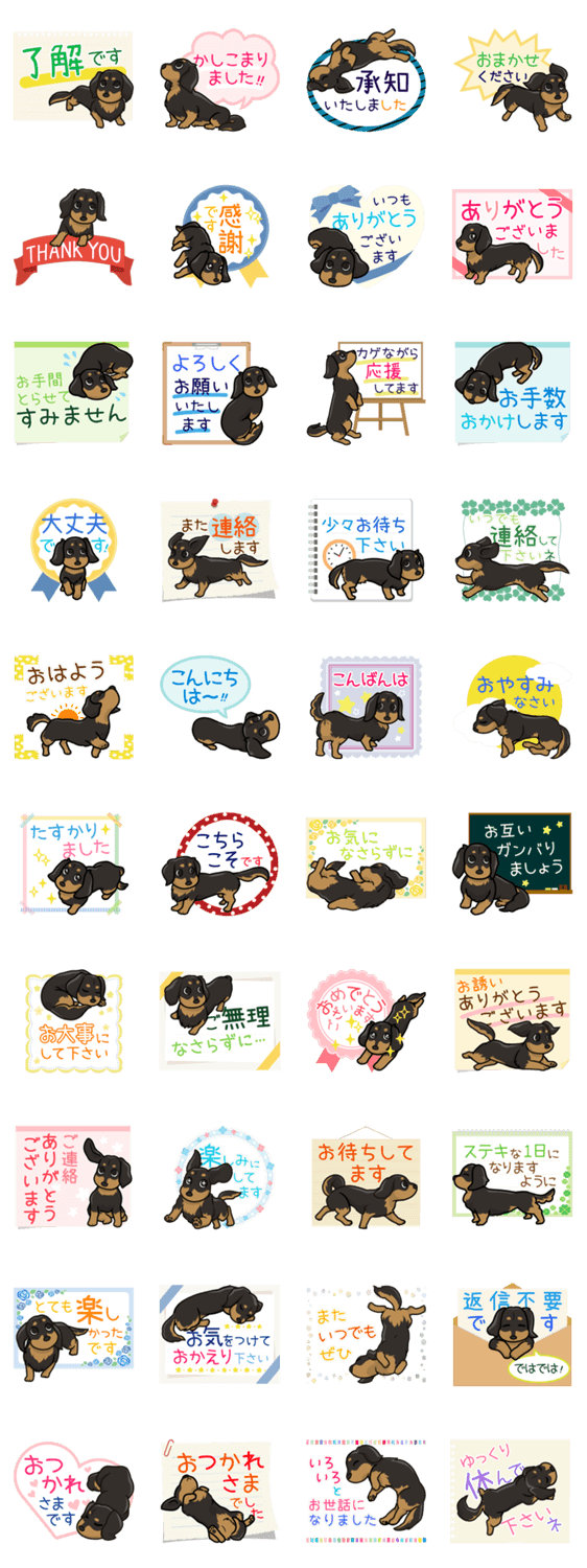 | スタンプ説明 | ダックスフンドのかわいいポーズに癒されるメッセージ デカ文字で見やすく丁寧で思いやりのある言葉は大切な人や年上の人にも送りやすく、気持ちも伝わります! 大人可愛い |