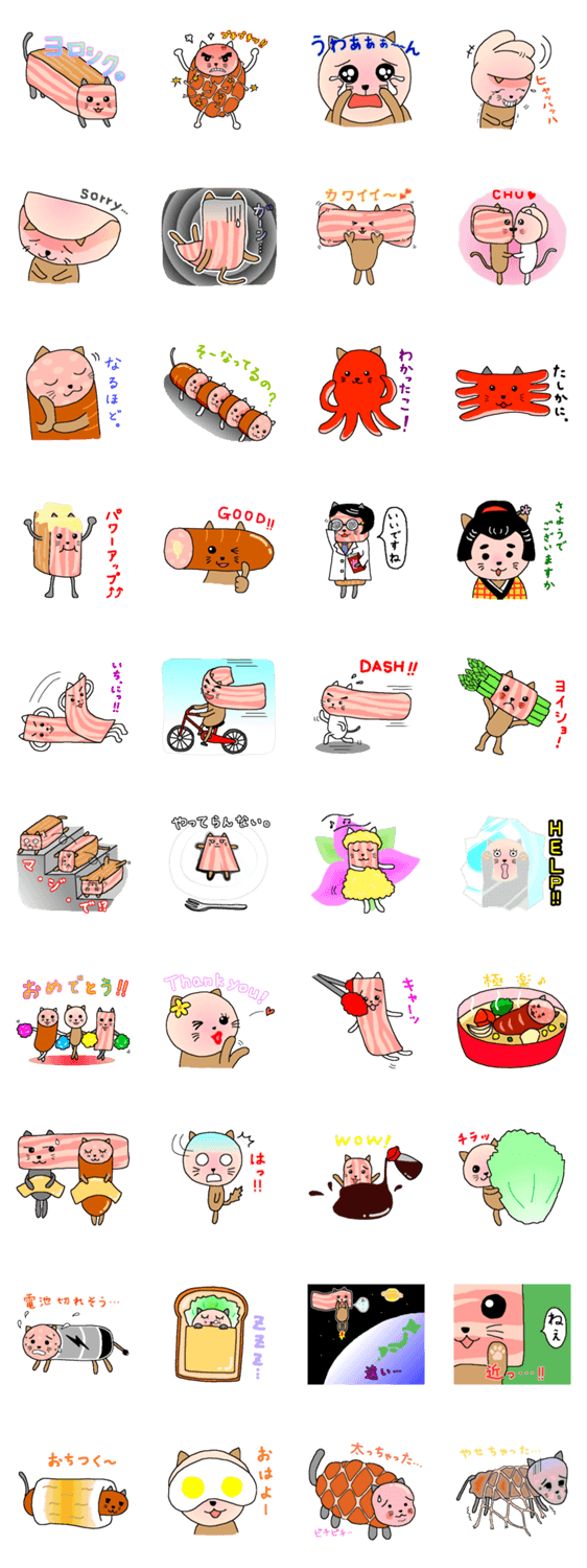 ハム、ベーコン、ウィンナーの形をしたネコ達のにぎやかなスタンプです。