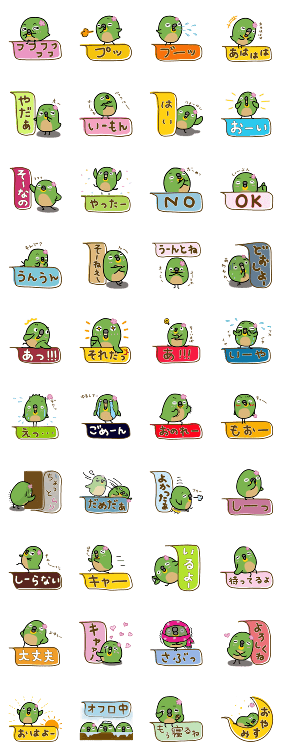 野鳥 メジロの、Hana*ちゃんのスタンプです♪挨拶や返事など、気軽に使える物を揃えました。言葉がふきだしになってるので、見やすくなってます♪