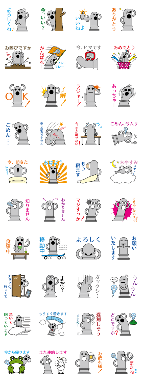 挨拶や返事、待合わせなど、LINEで使いやすい言葉に、とぼけた表情のハニワンを組合わせてみました。相棒のヒト玉君もいい味出してます。