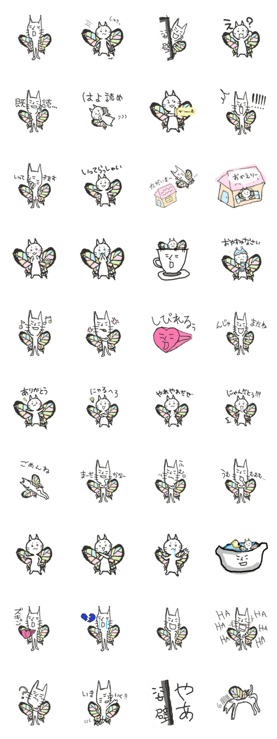 ミステリアス&可愛い2匹の使いやすいスタンプ♪ちょうちょと猫を合わせたキャラクターなので、猫好きや蝶好き、虫が苦手なあなたにも!未読や既読にかまって攻撃!