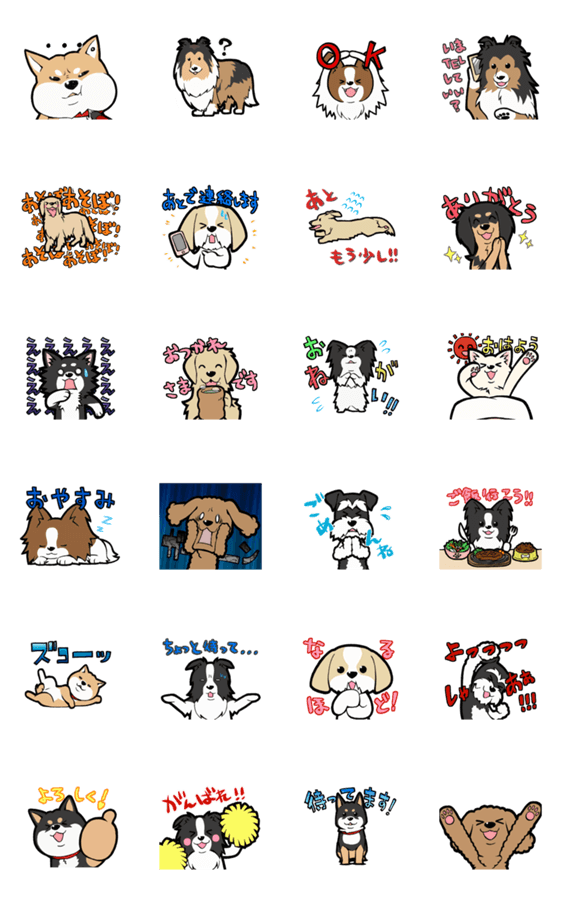 パピヨン、柴犬、トイプードル、チワワ、ゴールデンレトリバー、ダックスフンド、シュナウザー、シーズー、コリー、ボーダーコリーの動くスタンプです