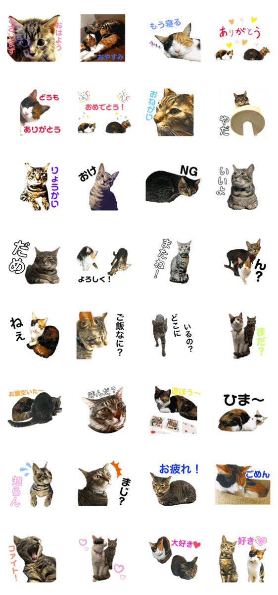 LINE Creators Studioで作った三毛猫とキジトラのスタンプです。