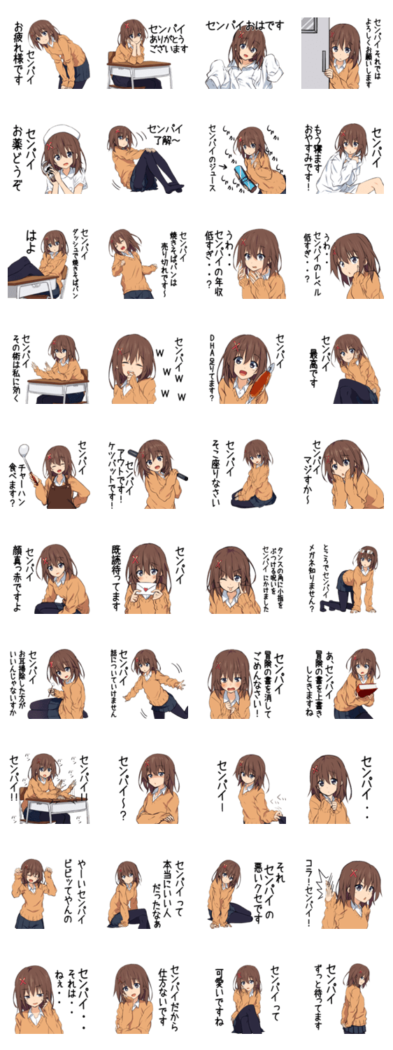 センパイに毎日送れる後輩スタンプです。 会社のセンパイ、学校のセンパイ、人生のセンパイ等 色々なセンパイへお送りください。