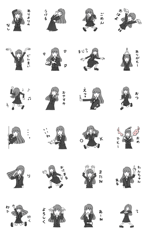 ユニークなポーズとレトロな制服とJK語のスタンプ。