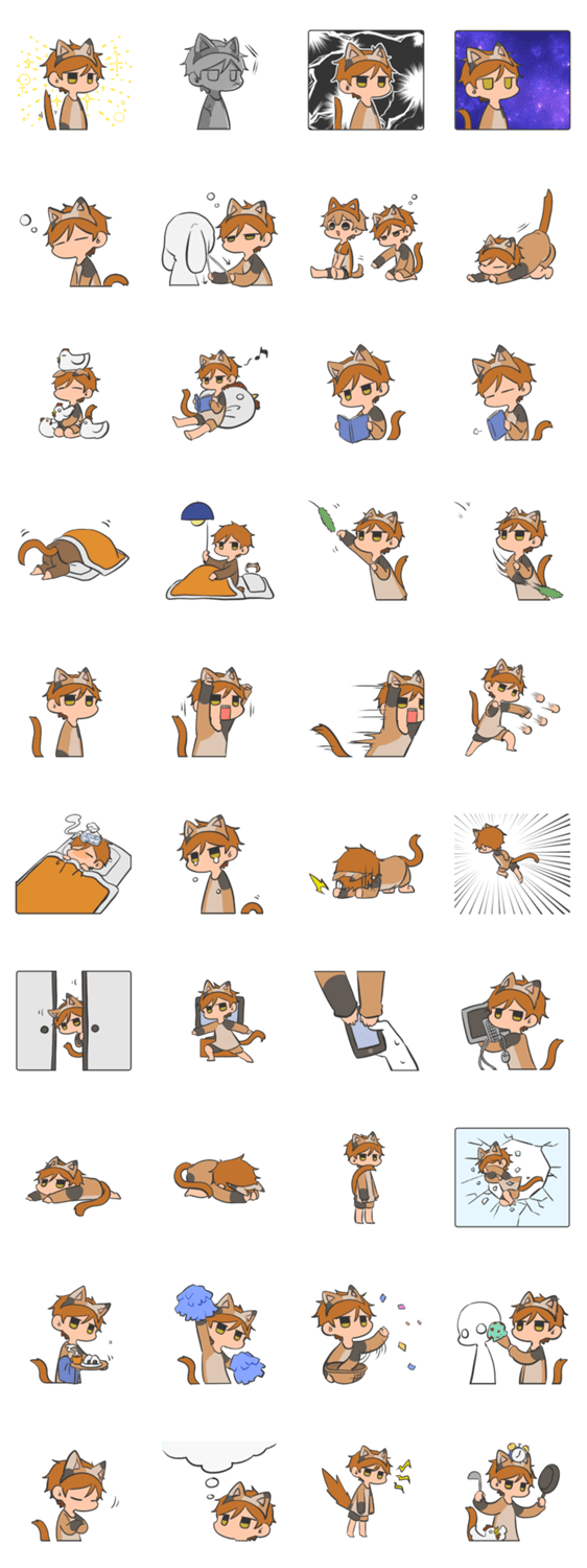 猫耳カチューシャの男の子のスタンプ第二弾。眠いときや相手に構ってほしいときに使えるかもしれません。