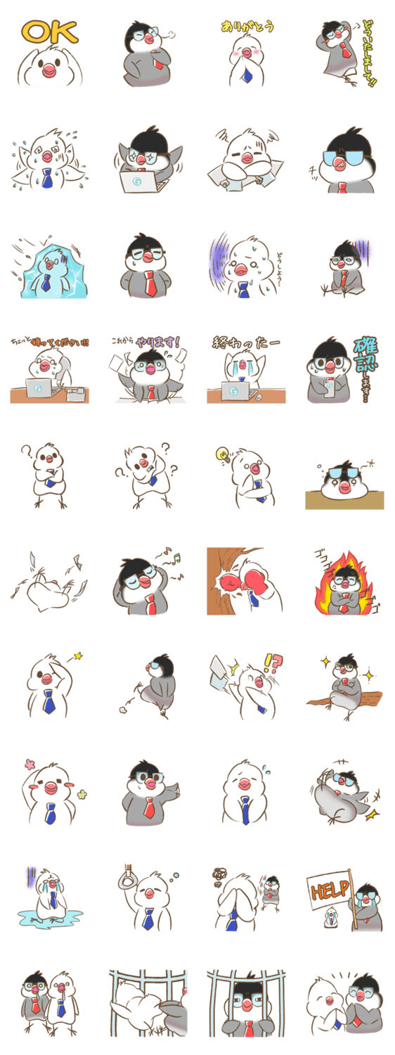 頼りになる上司:あかつきさん、努力家新入社員:かずくん 2羽の文鳥の日常を描いたスタンプです