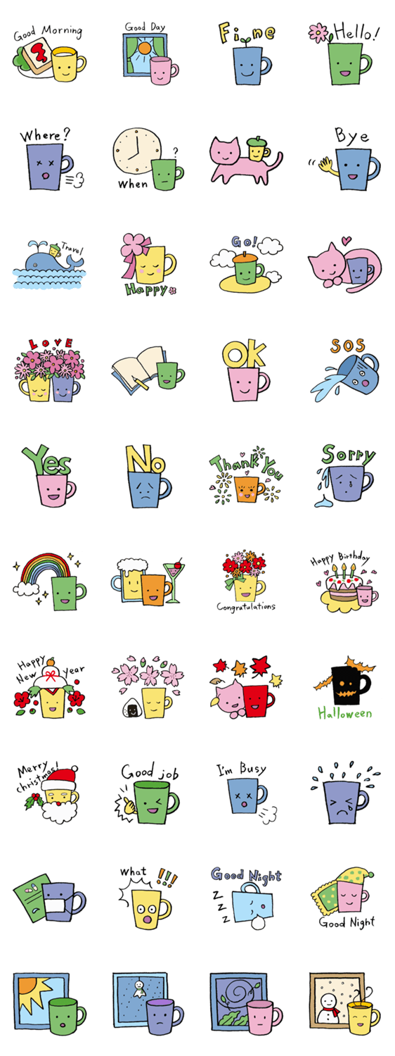 おはよう・こんにちは・おやすみなどの挨拶から誕生日・お正月・お花見・紅葉など季節のイベントや天気・感情など毎日使える、カラフルでかわいい英語のスタンプです。