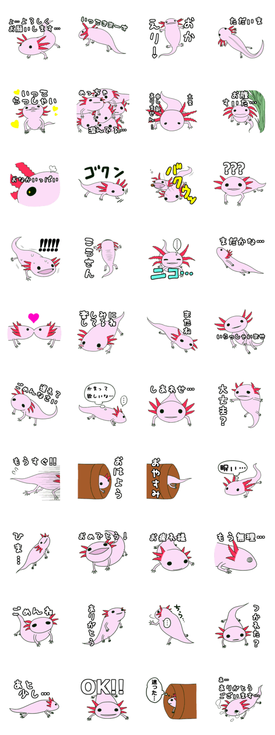 よく使うあいさつ等を中心にした、ゆるい感じのウーパールーパースタンプです。