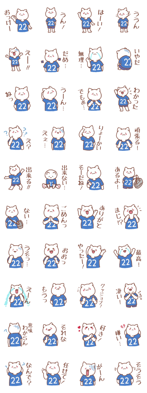 22番の青いユニフォームをきた猫のスタンプです!返事をするのに便利な組み合わせ!野球・サッカー・バスケ・バレー・ハンド・アメフト等々スポーツチームの#22へ!