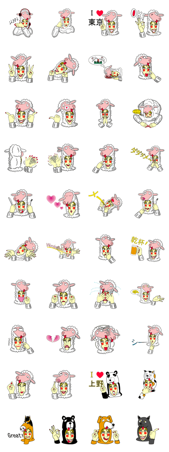 羊の被り物をかぶったハニーがいろいろな表情をします。おまけで、猫、パンダ、馬、熊、犬、馬、豹の被り物もありますよ。