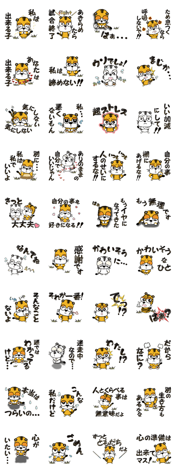老眼用大きめ文字。多分トラかな?怒ったり、落ち込んだり、開き直ったり、心乱れている時に使えるスタンプです。恋人同士、家族、友だち、みんなで使ってください。