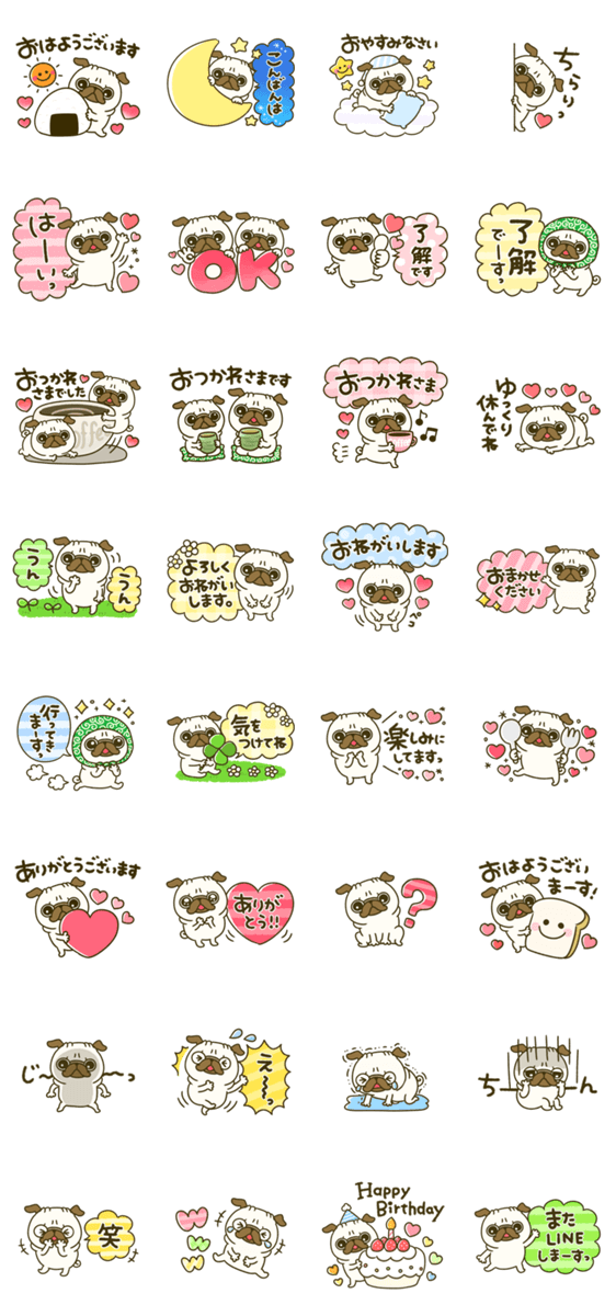♡パグちゃんの毎日使える言葉がいっぱいのスタンプです♡ 犬/パグ/カラフル