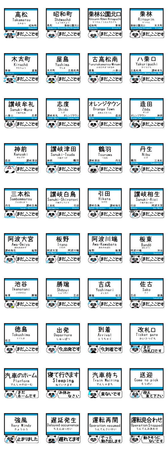 かわいいパンダが四国高徳線(高松,昭和町,栗林,木太町,屋島,古高松南,讃岐牟礼,志度,神前,讃岐津田,丹生,三本松,引田,板野,阿波川端,板東,勝瑞,吉成,佐古,徳島)駅名を連絡