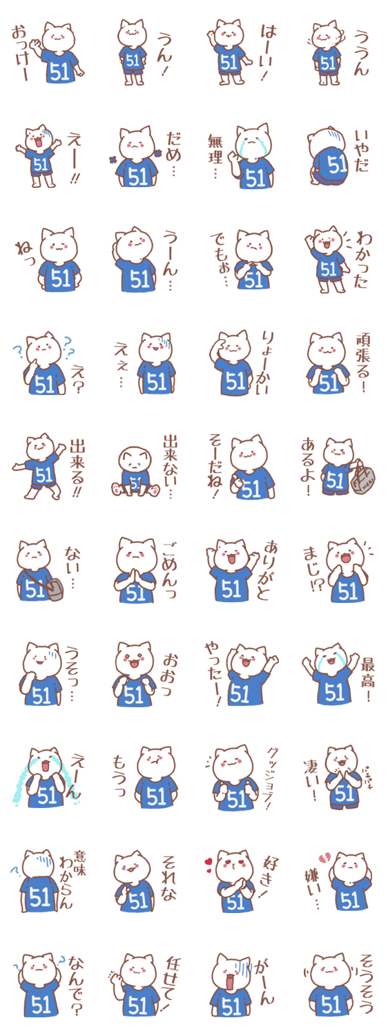 51番の青いユニフォームをきた猫のスタンプです!野球・サッカー・バスケ・バレー・ハンド・アメフト・ラグビー等の背番号、出席番号などお好きな数字をどうぞ!