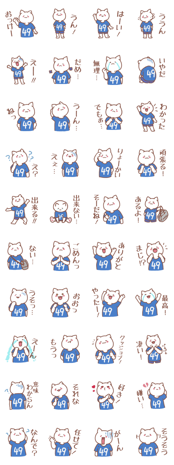 49番の青いユニフォームをきた猫のスタンプです!返事をするのに便利な組み合わせ!スポーツチームの背番号、出席番号等お好きな数字をお使いください!