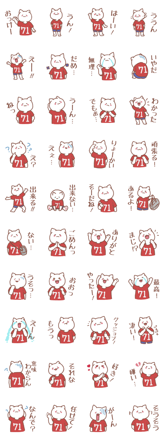 71番の赤いユニフォームをきた猫のスタンプです!野球・サッカー・バスケ・バレー・ハンド・アメフト・ラグベー等の背番号、出席番号などお好きな数字をどうぞ!