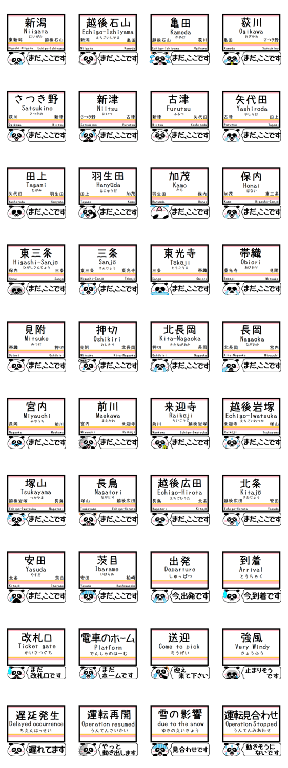 かわいいパンダが信越本線(新潟,越後石山,亀田,荻川,さつき野,新津,古津,矢代田,田上,羽生田,加茂,保内,三条,帯織,見附,押切,長岡,宮内,前川,塚山,北条,茨目)駅名をご連絡