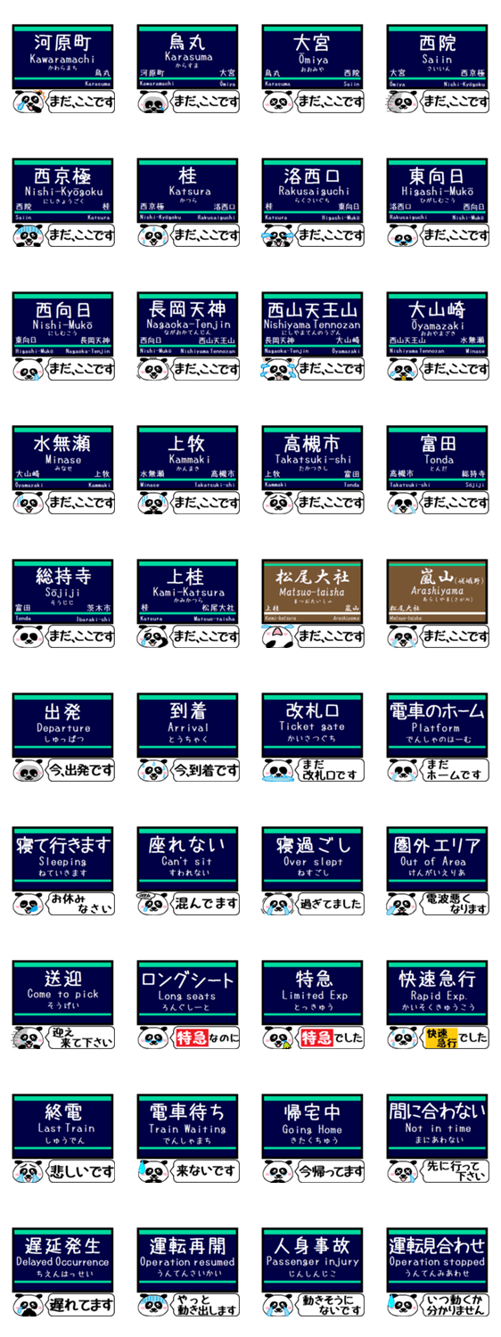 かわいいパンダが京都線(総持寺,富田,高槻市,上牧,水無瀬,大山崎,西山天王山,長岡天神,東向日,洛西口,桂,西京極,西院,大宮,烏丸,河原町)嵐山線(上桂,嵐山)駅名をご連絡