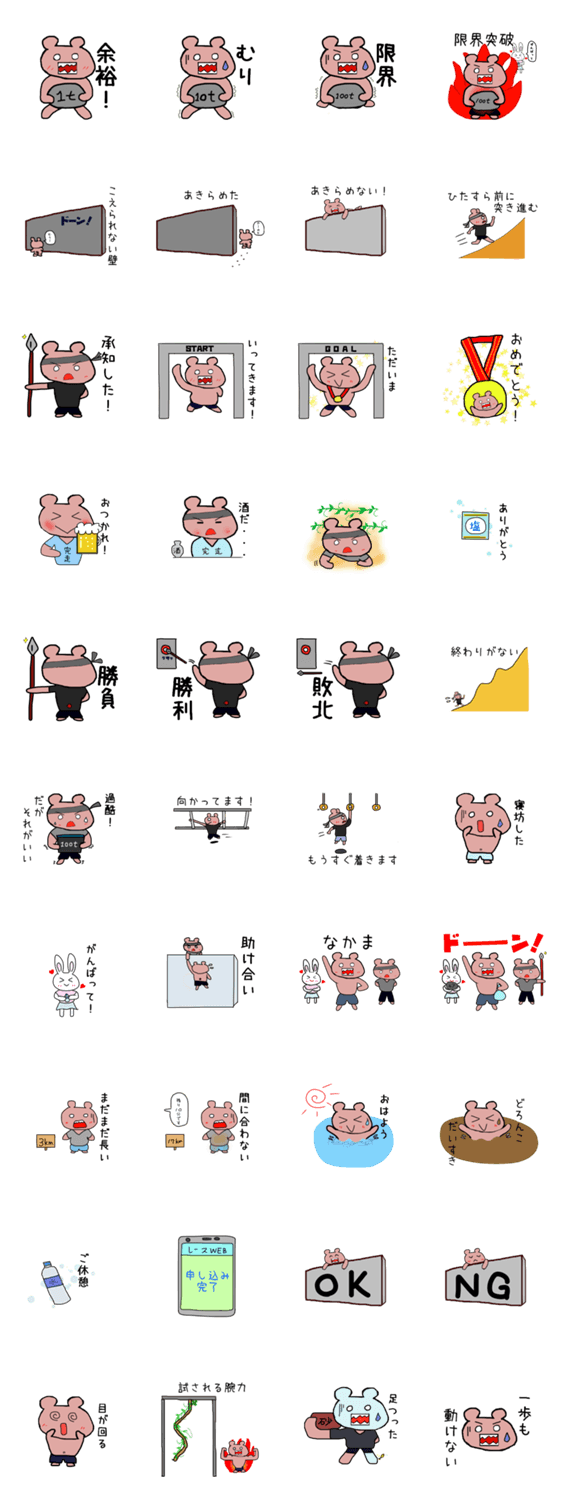 障害物競争・障害物レースに挑戦するクマと仲間たちのスタンプです。