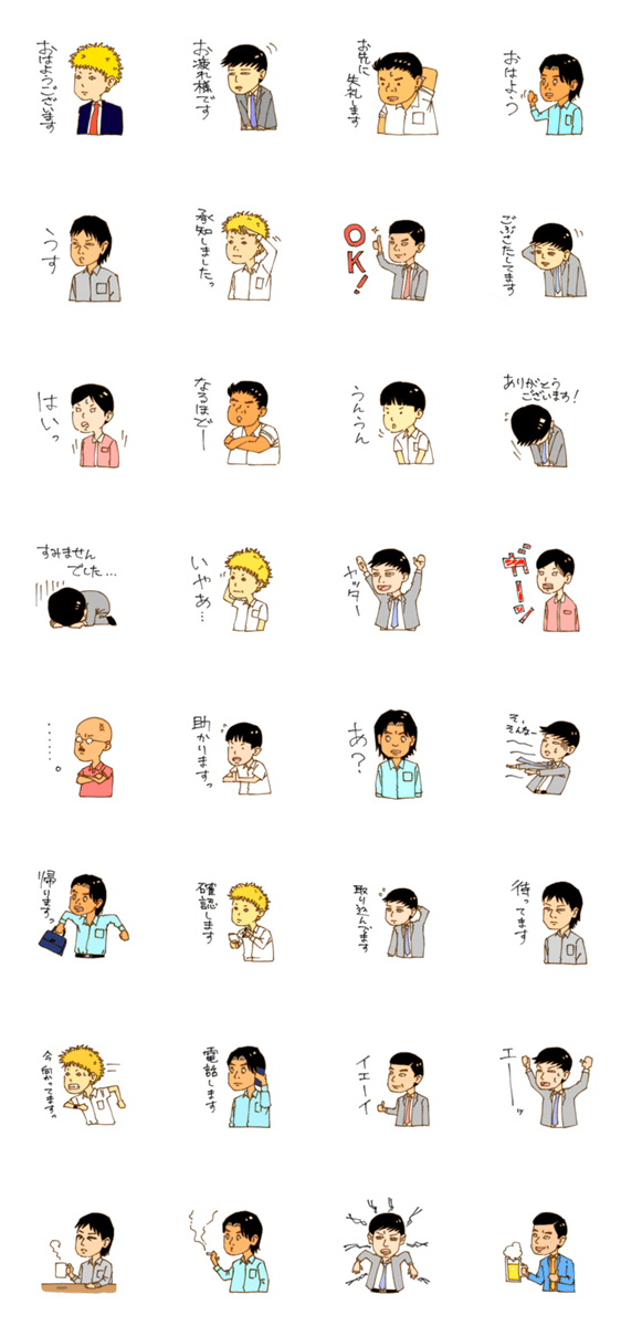 日本のサラリーマンを特集したスタンプです。サラリーマンの人もサラリーマンじゃない人も、ぜひ使ってみて下さい。