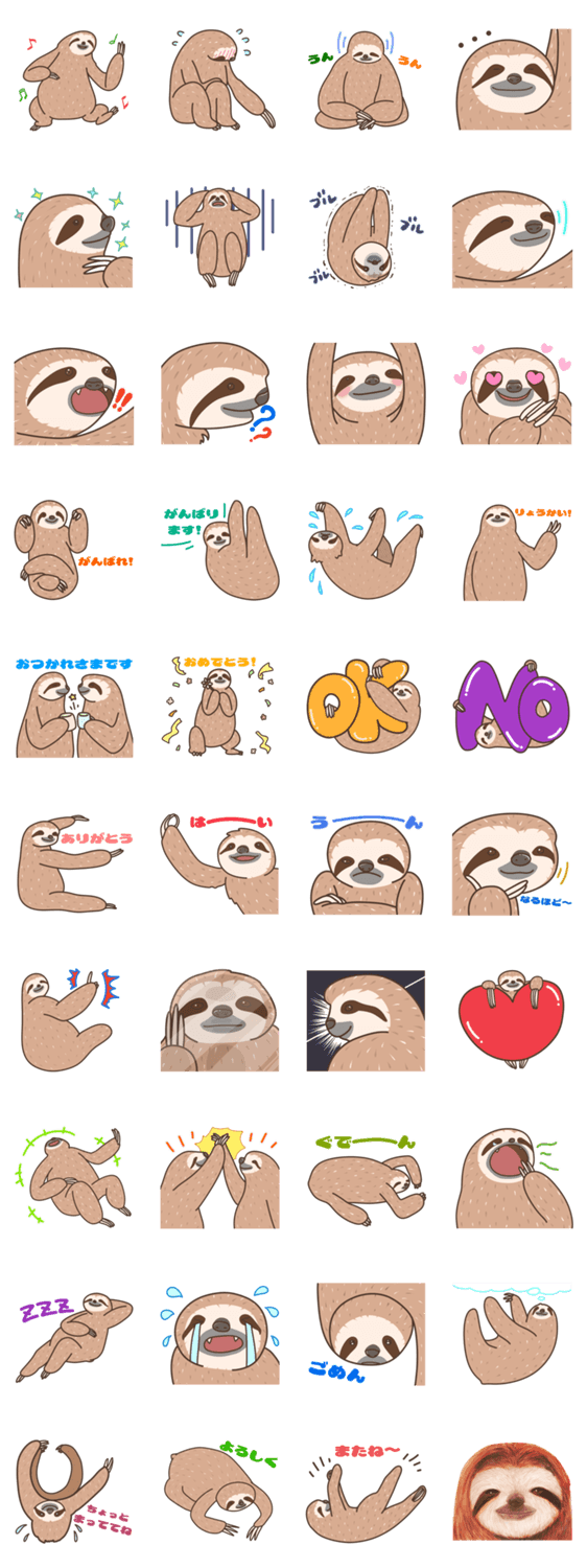 ナマケモノのスタンプです。彼らの表情や日常の動きを楽しんで下さい。きっとあなたもナマケモノ好きになる!