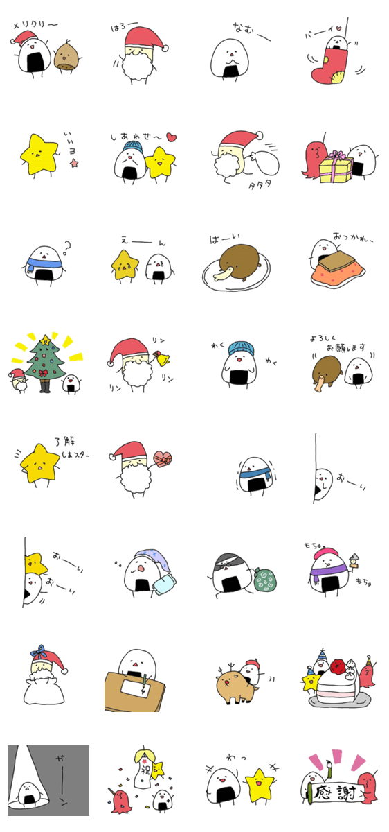 おむすびのりおのクリスマス! クリスマス限定の友達、 星野くんとチキンちゃんも仲間入り。 サンタも遊びに来たよ。使う機会は限られるけど、よろしくね