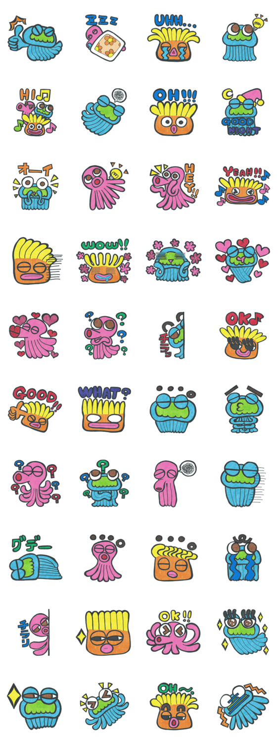 くらげのにょろりん、いそぎんちゃくのぬるるん、たこのにょろろん達の太平洋スタンプ(^ω^) 「paasnep」第四弾スタンプ。
