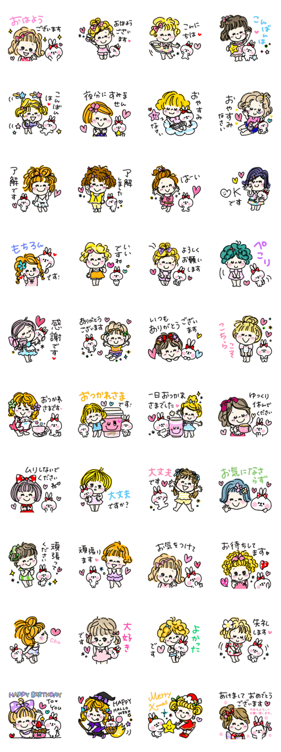 笑顔いっぱいのガールズとウサギのスタンプ。日常でよく使う敬語の挨拶や言葉を集めました。お誕生日・ハロウィーン/ハロウィン・クリスマス・お正月/年賀状、入り☆