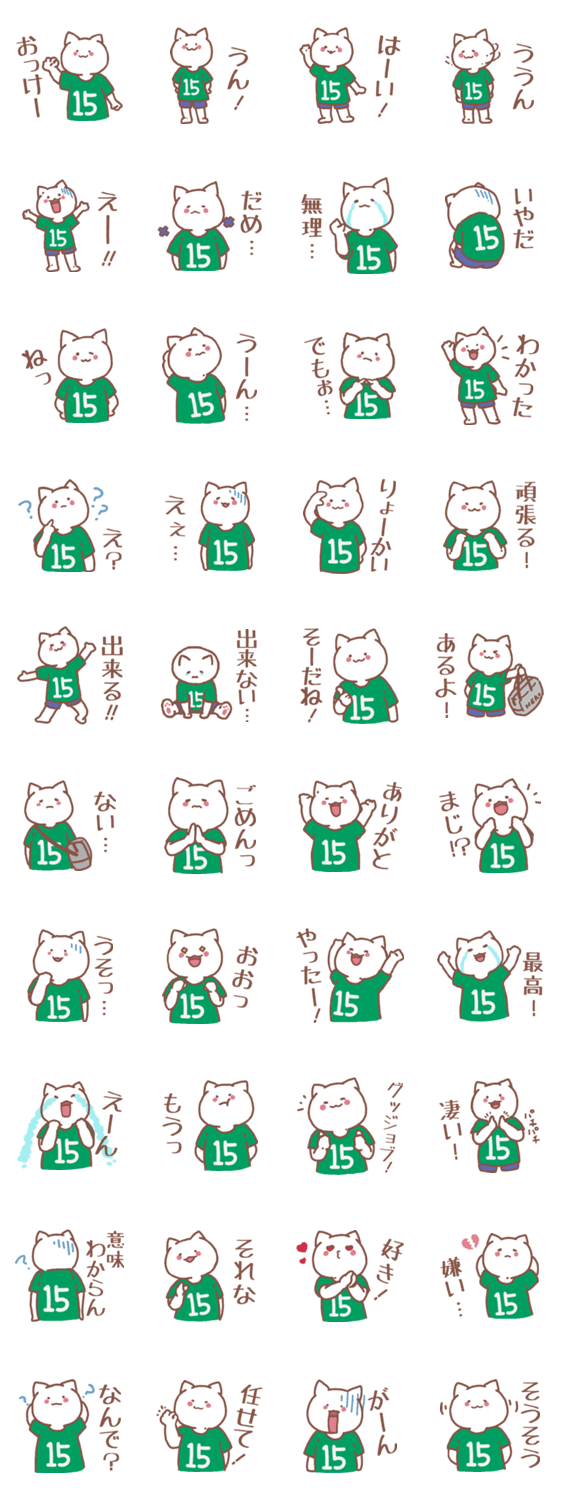 15番の緑色ユニフォームをきた猫のスタンプです!野球・サッカー・バスケ・バレー・ハンド・アメフト・ラグベー等の背番号、出席番号などお好きな数字をどうぞ!