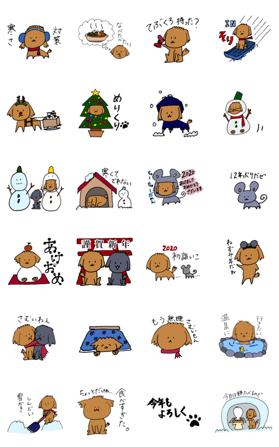茶色のトイプードル(たまに黒いトイプードル)の冬休みスタンプです。2020年はねずみ年ですね!
