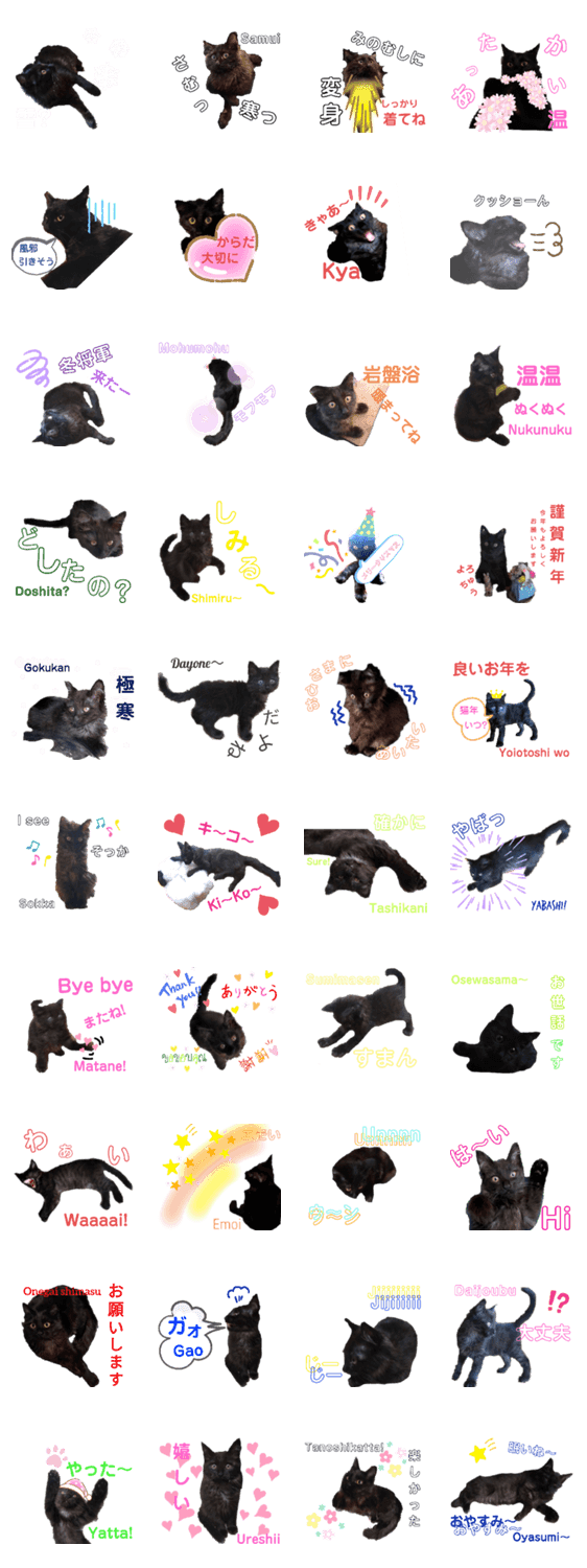 冬の寒いひと時を黒色の子猫スタンプでお楽しみください。 ローマ字でも表現を表示しました。日本語勉強の海外の方にもつかってもらえたらうれしいです。