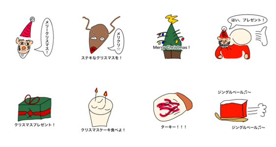 絵心がない人が描いた、斬新なスタンプです。斬新すぎて、逆にアート的なものも混ざってます。今回はクリスマスバージョンです。