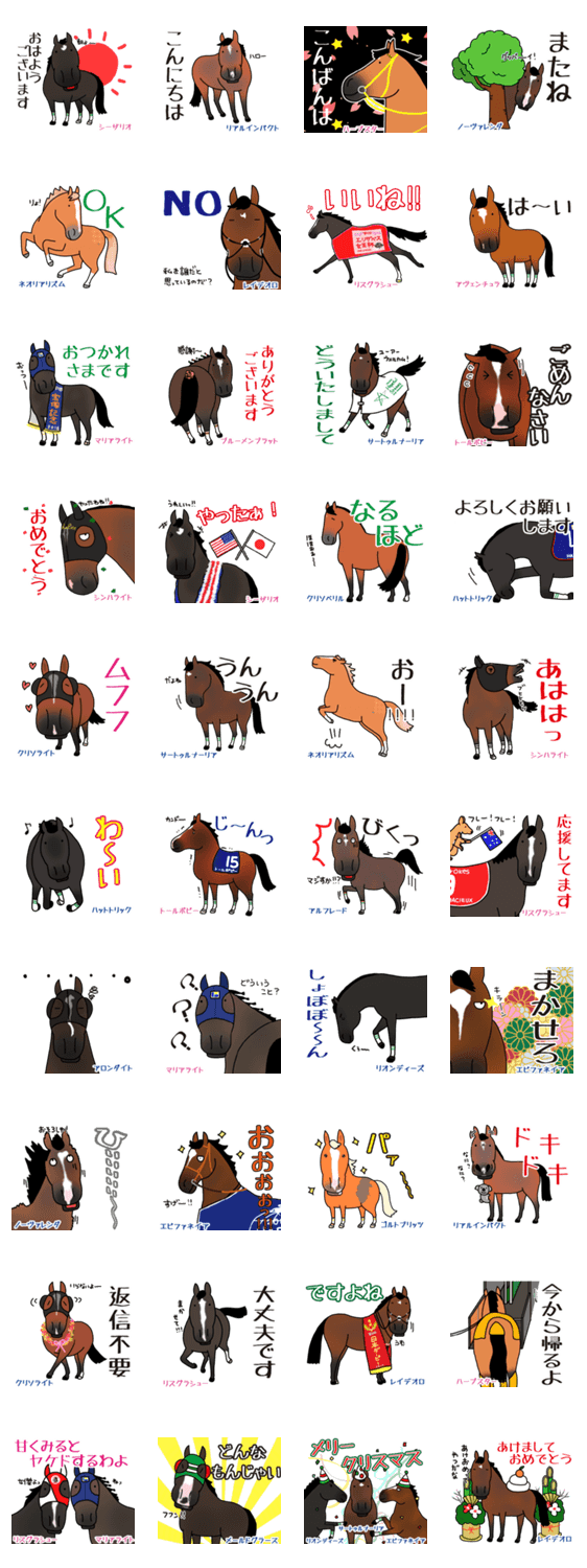 おがわじゅりの描く、キャロットクラブの馬たちのスタンプ登場~ 第1弾はGI・JpnI勝ち馬!