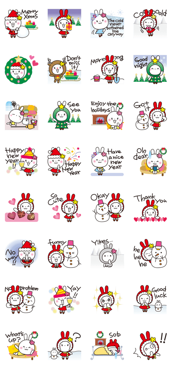 可愛い白うさぎの日常使いスタンプ。クリスマス~年末年始、バレンタイン、いろいろなシチュエーションで使える冬[英語]バージョンです。