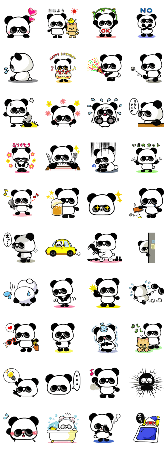 ダンディなパンダと思いきや、サングラスをはずすと じつは、、、。日常会話で使いやすいスタンプになってます。