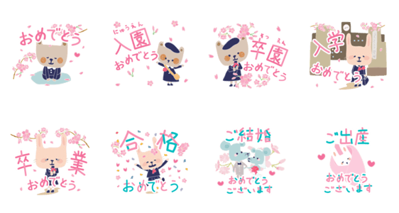色んな祝福を詰め込みました。 うさぎや猫などの動物たちの可愛らしいスタンプです。