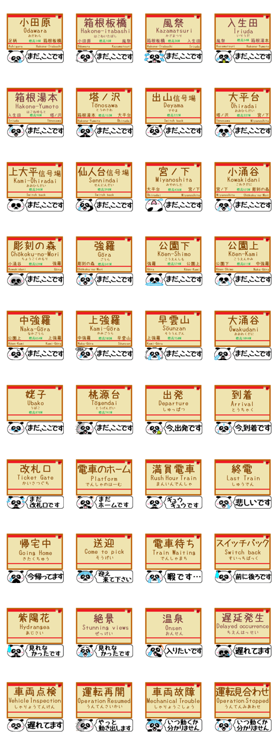 かわいいパンダが箱根登山(小田原,風祭,入生田,箱根湯本,塔ノ沢,大平台,宮ノ下,小涌谷,強羅)ケーブルカー,ロープウェイ(中強羅,上強羅,早雲山,大涌谷,姥子,桃源台)駅名連絡