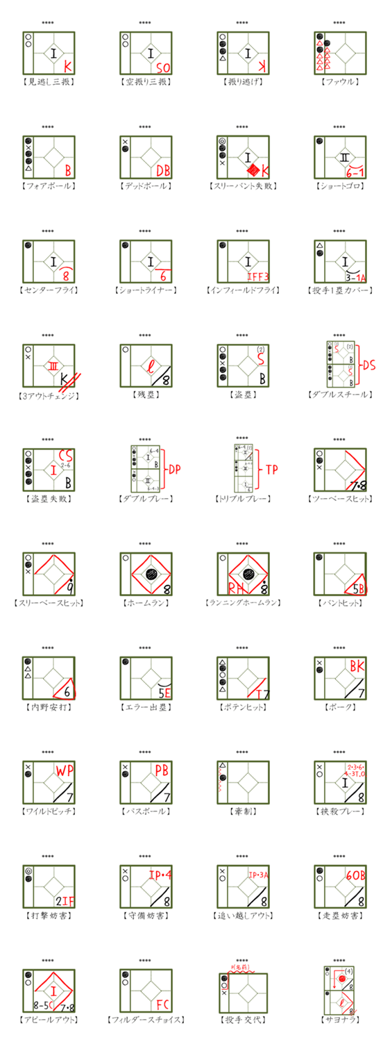 色々な場面で使えるセリフに、一応スコア付けときました。マニアックですが、野球好きやスコアブック覚えたい方にも是非。 ※スコアの付け方には個人差があります。