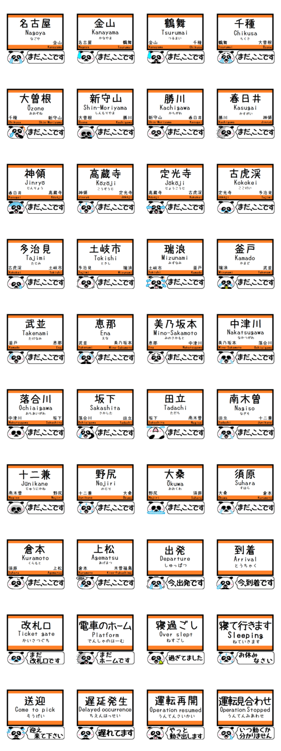 かわいいパンダ中央本線(名古屋,金山,鶴舞,千種,大曽根,新守山,勝川,春日井,神領,高蔵寺,古虎渓,多治見,土岐市,釜戸,武並,恵那,田立,南木曽,野尻,大桑,上松)駅名を連絡