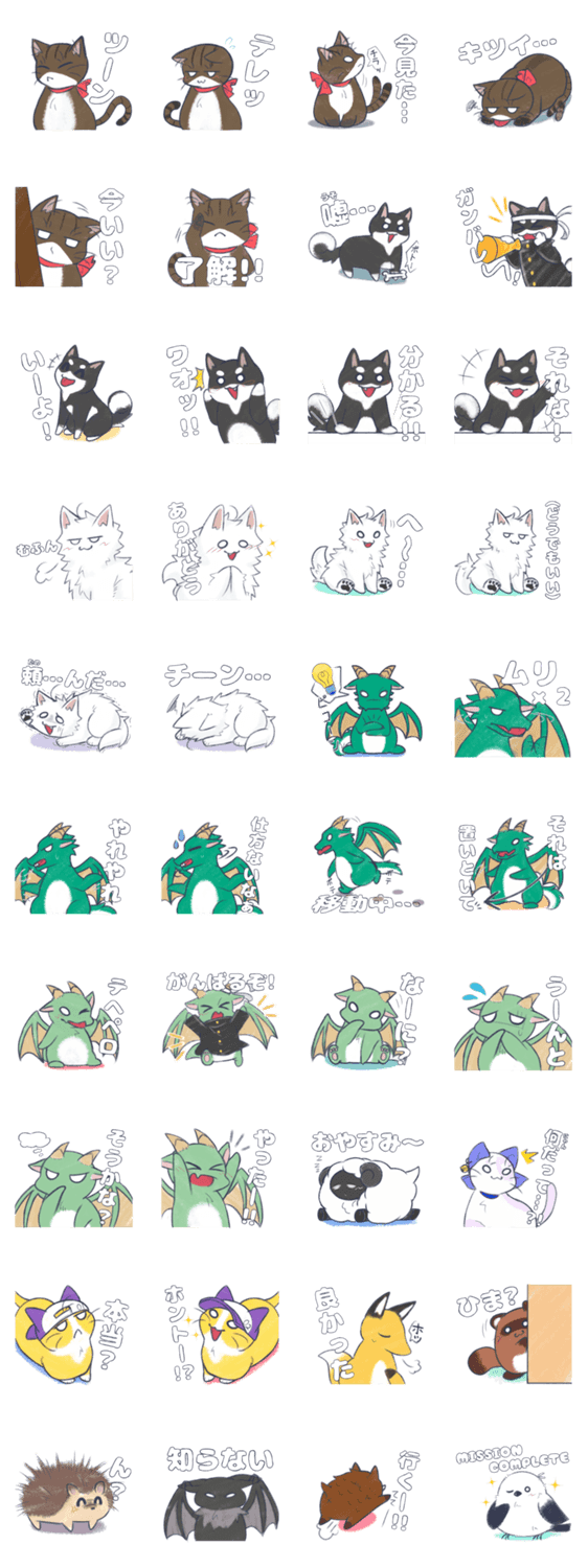 猫のミミ·犬のクロ·狼のロナ·竜兄弟のラルドとミントと、その他モフモフな毛玉達のクレヨン風スタンプ第2弾です! 会話向けのシリーズです!