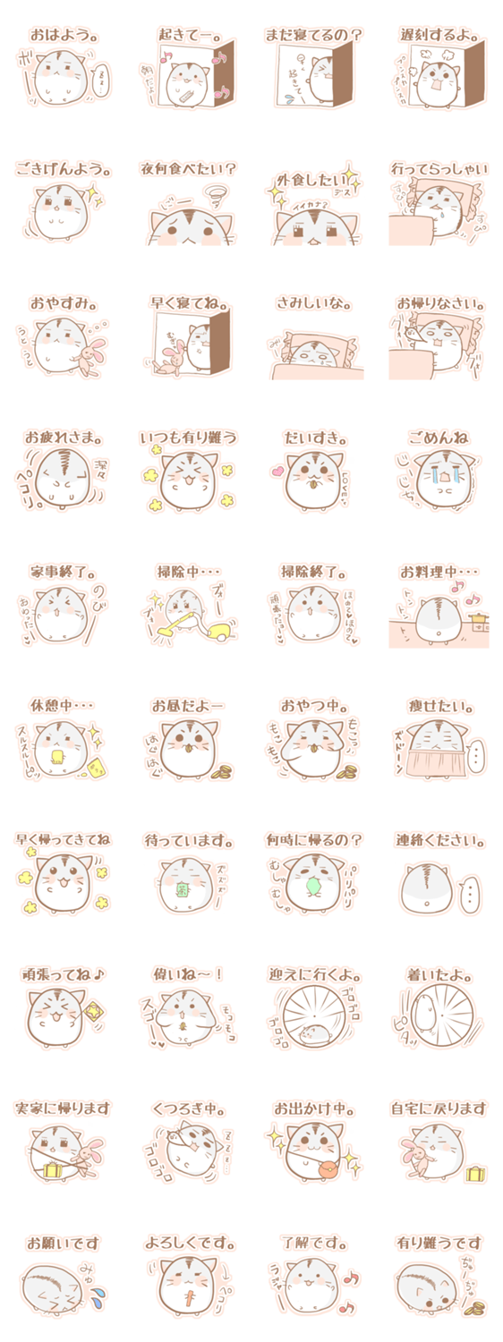 主婦のハムスターの日常をスタンプにしました。旦那さんや同棲中の彼氏さん、ママ友に、ハムスターが変わりにあなたの日常を伝えます。