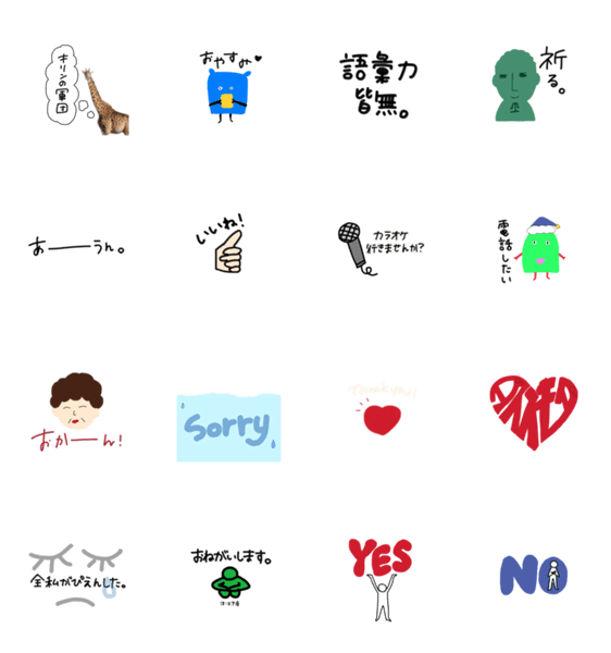 みえたん、しらたき、つめきり、きたかぜによる謎の軍団のスタンプ。きたかぜの手書きです。