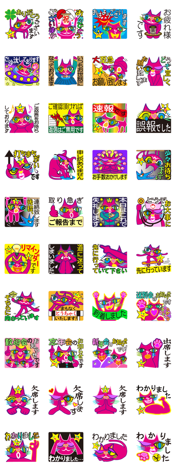 全身ショッキングピンクな変幻自在キュート猫☆ ネコ ♪ ねこ! 第4弾は、仕事や会社で重宝する敬語を含む便利な様々な表現が満載の仕事編♪ 人間関係の潤滑剤にしてネ☆
